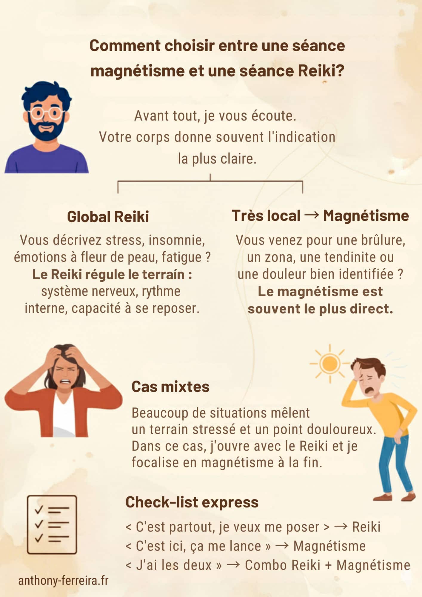 Dans ce cas, la synergie est la meilleure solution : j’ouvre la séance avec le Reiki pour apaiser le système global, puis je focalise en Magnétisme à la fin pour soulager la zone cible.